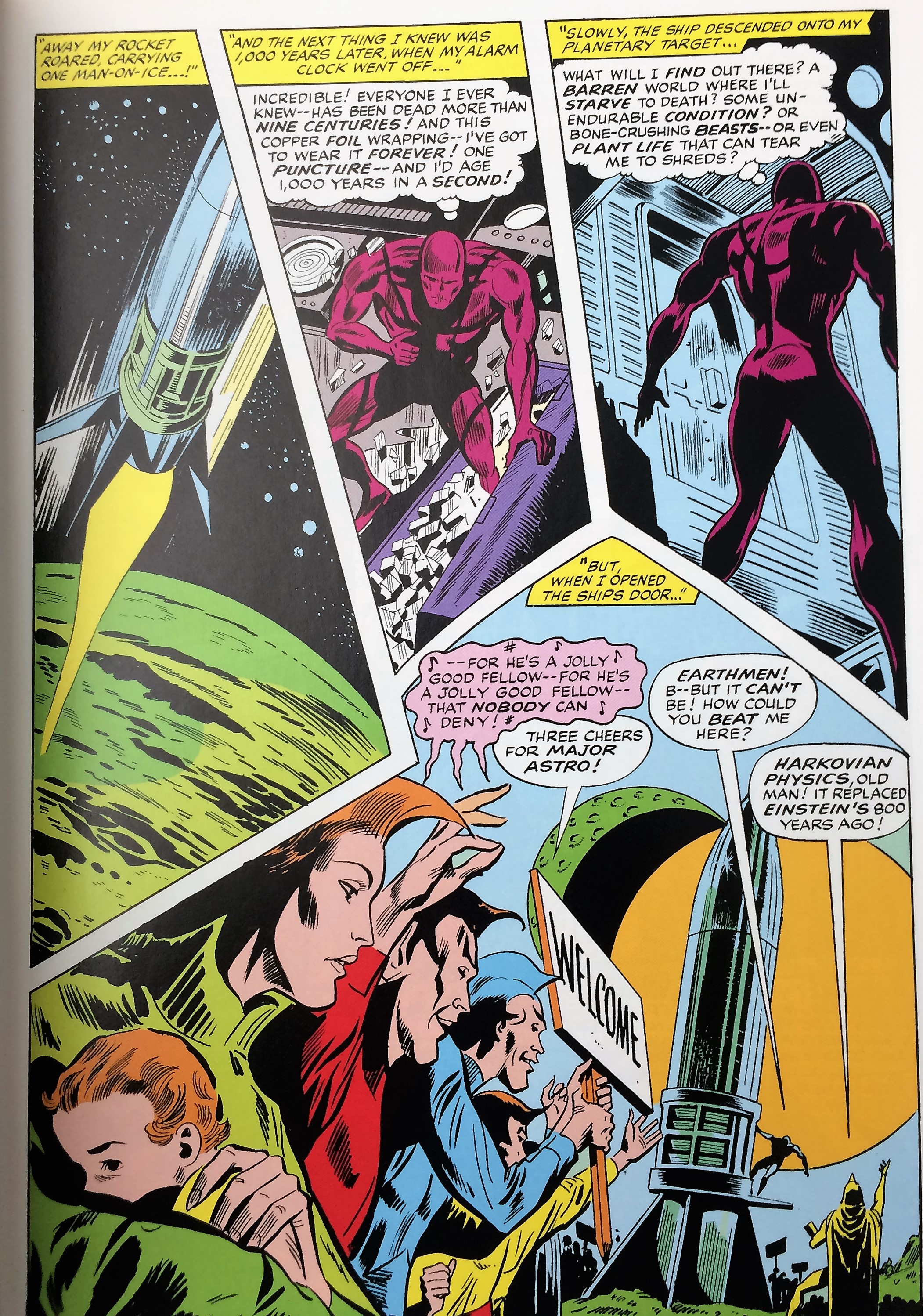 Vance Astro e a Ironia Suprema. Um dos aspectos mais originais desta história é, sem dúvida, a dramática situação de Vance Astro. Antes de comentar sobre isso, vale ressaltar que o autor o caracteriza com 2 situações únicas, que o distinguem totalmente de seus companheiros: é o único terráqueo e veio do século XX, ou seja, 1.000 anos atrás (ele é, portanto, um herói “fora do seu tempo”, como o Capitão América naquela década, mas de uma maneira muito mais radical). Uma terceira característica, que aqui na edição original Drake apenas deixa em aberto, e que foi acrescentada por outros escritores, é que ele era mutante. Mas, voltando à sua origem, vale lembrar que o herói não passou por um deslocamento temporal. Vance foi selecionado pelo governo americano para ser o único astronauta em uma missão com destino ao sistema solar vizinho, Alfa Centauro. O problema é que a limitada tecnologia “da época” (do ano de 1988, lembrando que a revista foi escrita em 1968) gerava uma velocidade máxima ainda muito lenta, portanto o tempo da viagem seria de 1.000 anos. Vance foi colocado sob animação suspensa (outra situação similar à do Capitão) e despachado em um foguete. Contudo, nesse meio tempo os humanos desenvolveram uma tecnologia ultra veloz para viagens espaciais, o que permitiu colonizar outros planetas, inclusive de Alfa Centauro. Assim, quando o astronauta finalmente chegou a seu destino e foi descongelado, ao invés de ser um desbravador, uma multidão de terráqueos o aguardava! Ou seja, sua missão, seu sacrifício, foram completamente inúteis!