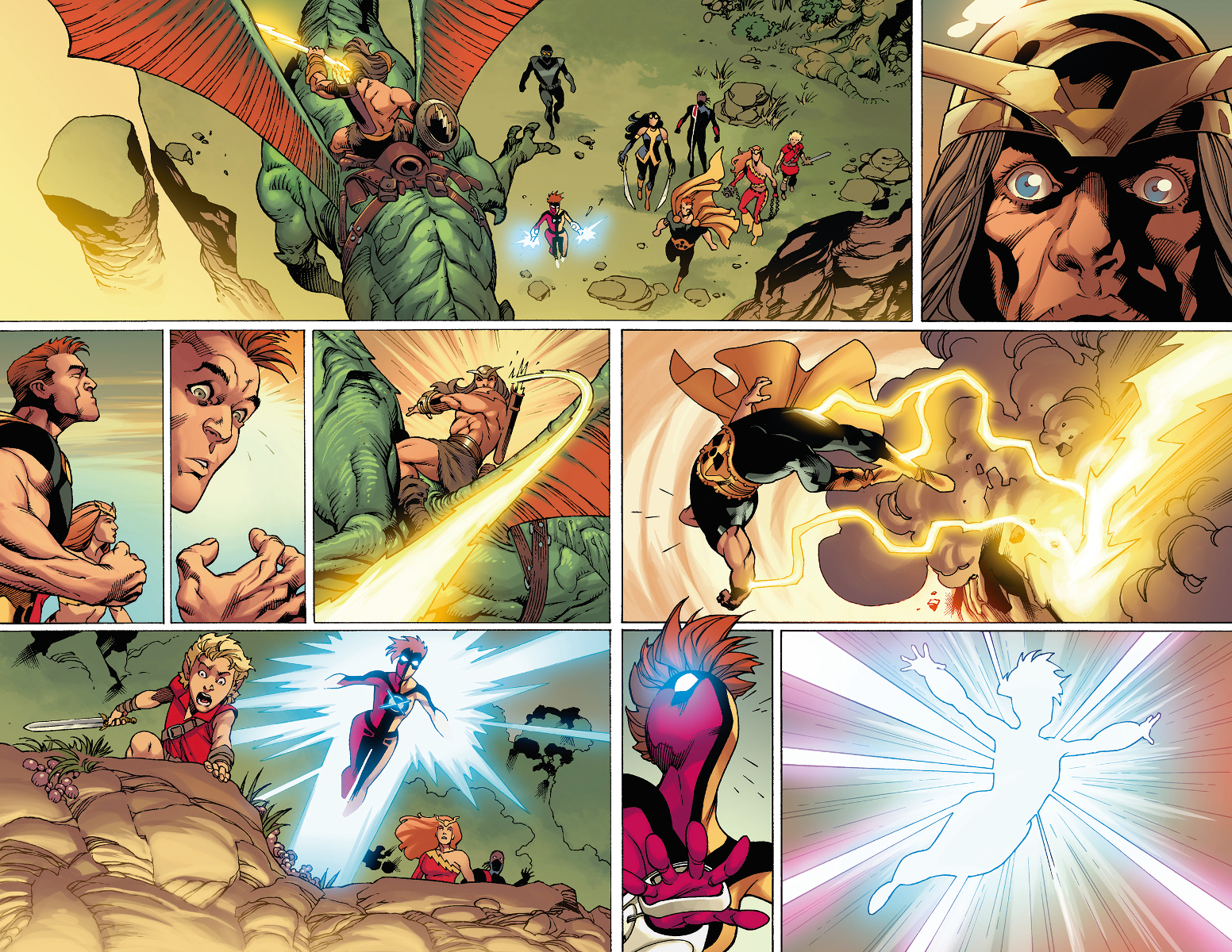 Muita coisa, mas muita coisa mesmo acontece nestas duas edições da série do Esquadrão. No geral, é uma emocionante conclusão para o primeiro arco, com vários fechamentos satisfatórios de pontos apresentados anteriormente. James Robinson engata novamente a 5a marcha, vista com eficiência nas primeiras duas edições e, tão logo o Esquadrão chega ao bizarro Mundo Estranho, uma sequência de eventos deixa a equipe em sérios apuros. Falcão Noturno e Vulto explicam porque são uma boa dupla de combate, e finalmente Tundra assume seu aguardado protagonismo. Traições e surpresas, do vilão principal ao resgate de um herói bem obscuro no Brasil, passando por uma espécie de guerreiros de Cristal que tiveram seus 15 minutos de fama em algum momento dos anos 1980 e muitos outros interessantes habitantes do Mundo Estranho compõem harmoniosamente a trama desta bem realizada saga, cujo autor claramente está curtindo muita liberdade criativa com todo o vasto elenco. Ele ainda faz uma graça com o “herói inspiração” de Hypérion (Superman, claro) e o Esquadrão ganha um novo membro. Leonard Kirk, com a ajuda dos arte-finalistas Paul Neary e Marc Deering, e do colorista Frank Martin, entregam uma HQ dinâmica, repleta de bons momentos, com ótimos enquadramentos, personagens lindamente retratados e o agradável gosto de um bom quadrinho Marvel das antigas.